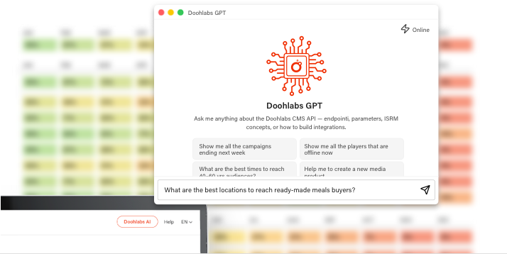 That is why the first feature highlighted in the vision is a conversational interface: Doohlabs GPT. It enables users to chat naturally about the status of media sales, screens, and the audiences reachable through the screen network.