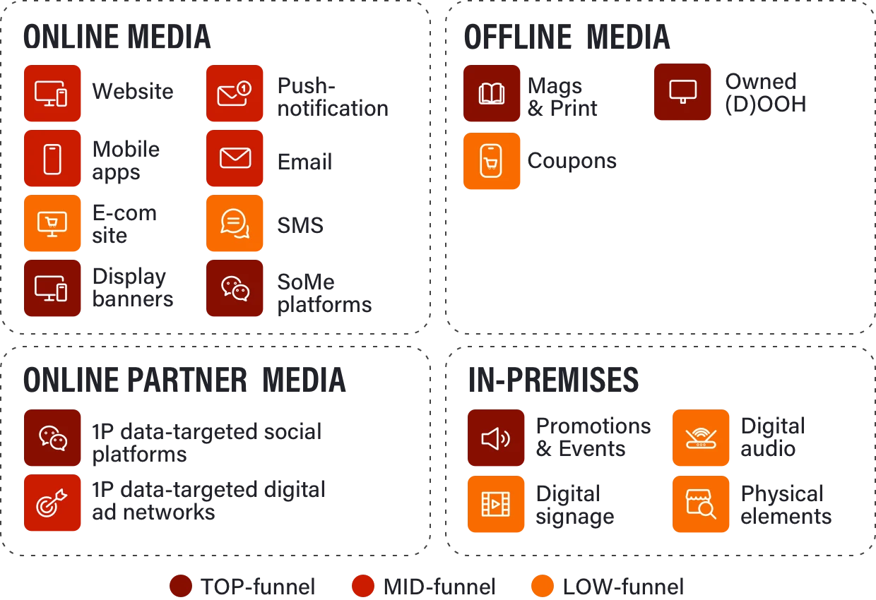 Contrary to what the dominance of online retail media in the US might suggest, retail media is inherently an omnichannel business. Beyond onsite placements in a webstore or app, it includes in-store media, CRM channels such as email or text messages, digital coupons, loyalty ecosystems, customer magazines, and many other touchpoints across the customer journey.